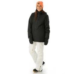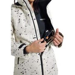- Zippered microfleece hand-warmer pockets, chest pocket with hidden zipper entry, media/goggles pocket, and mesh dump pocket